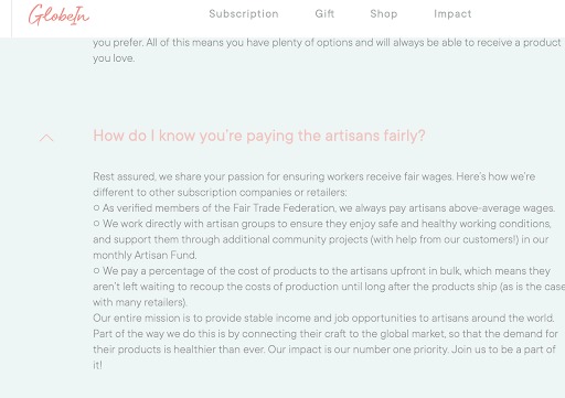 GlobeIn benutzt die FAQ-Seite, um ihre Nachhaltigkeit zu belegen und erklärt, wie die Firma arbeitet und dass sie ein verifiziertes Mitglied der Fair Trade Federation sind.