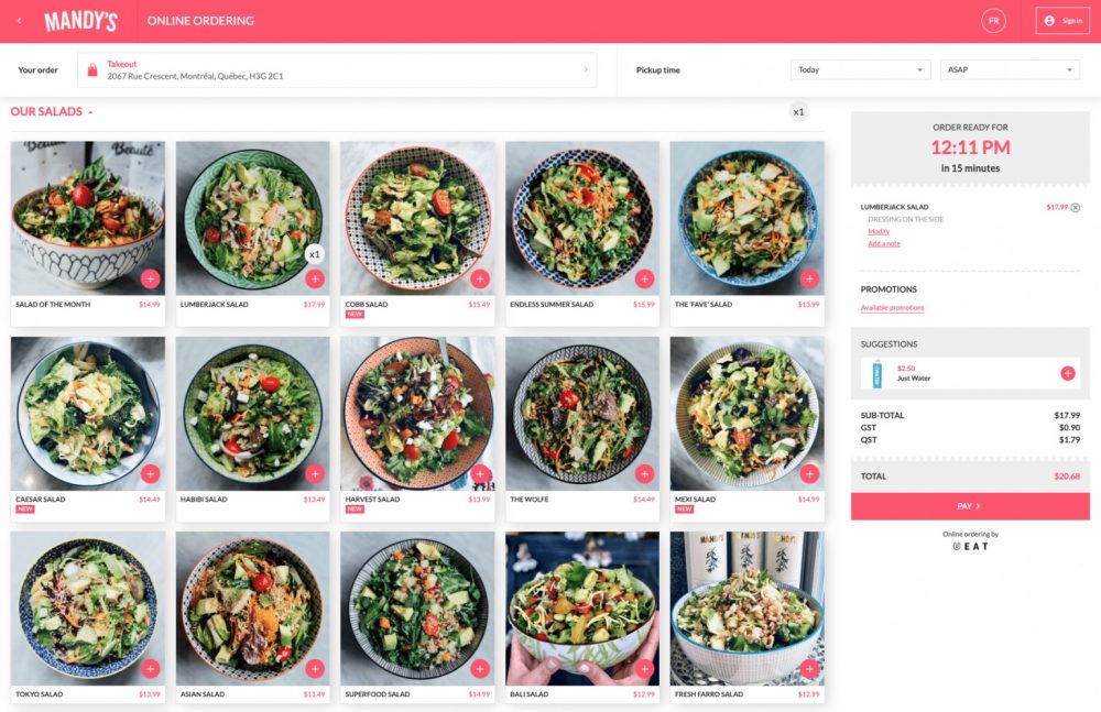 Mandy’s ist ein beliebter Gourmet-Salat Restaurant mit sieben Standorten in der Region rund um Montreal. Mandy’s bietet online Bestellungen direkt über ihre Website an, wo Kunden ihre Bestellung und den Standort zur Abholung auswählen können.