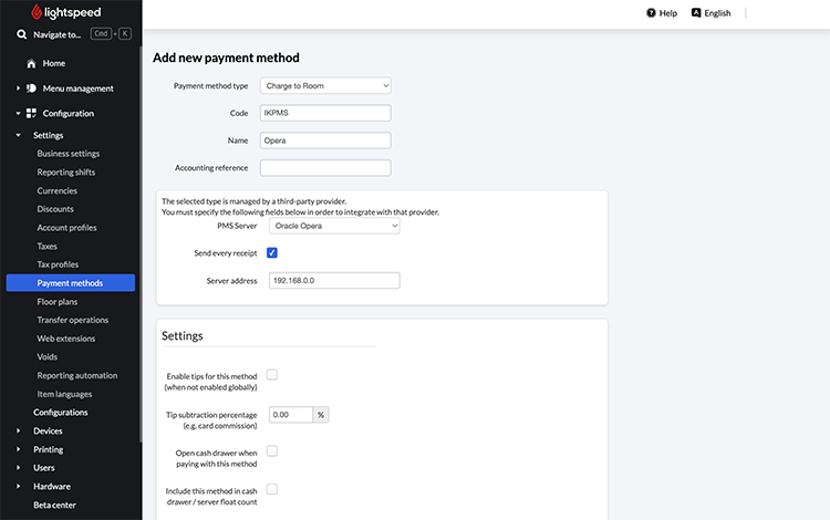 - Belasten Sie Quittungen und Zahlungen direkt mit dem Zimmer des Gastes in Mews unter Verwendung des Namens und/oder der Zimmernummer in Lightspeed.