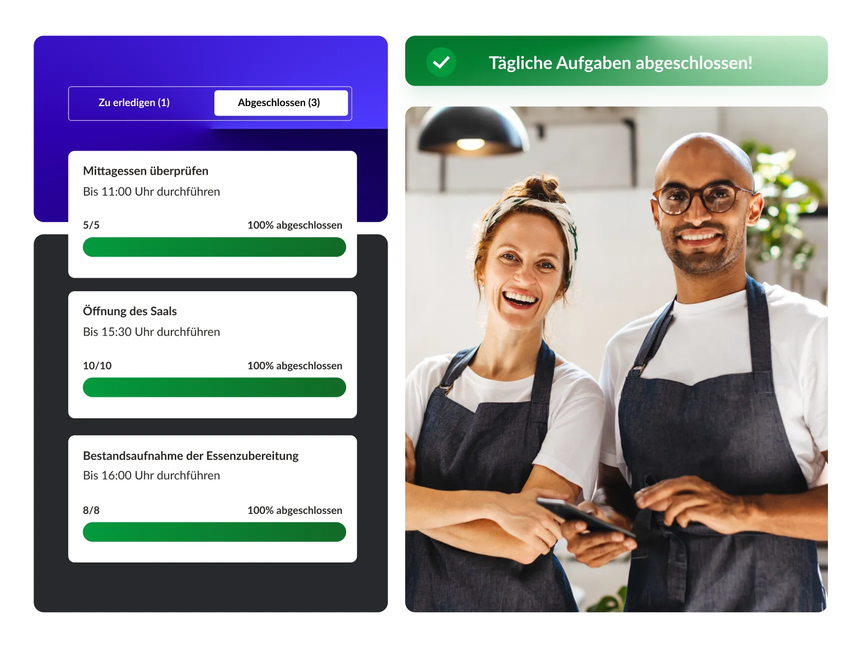 Schaffen Sie mehr Klarheit, Einheitlichkeit und Verantwortlichkeit in jeder Schicht. Mit einfach zu verwaltenden Checklisten bleibt Ihr Team stets auf Kurs und Ihre Prozesse laufen reibungslos und effizient.